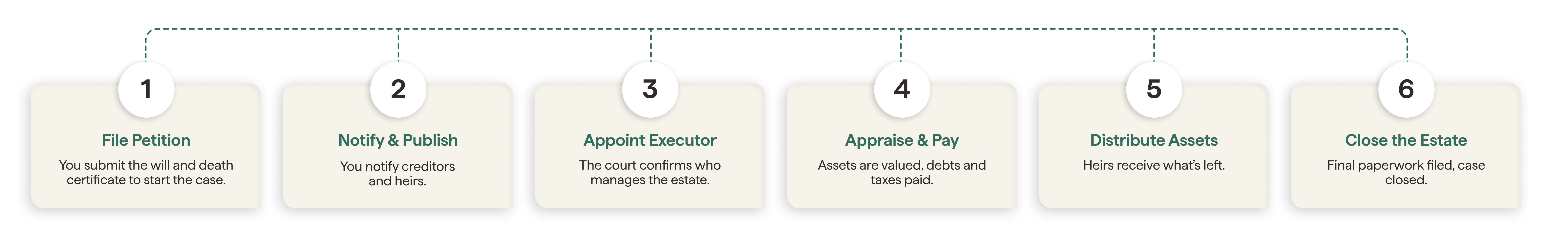 | 5. Distribution & closing | 2–4 months | File final accounting, attend hearing, get approval for final distribution, submit receipts, close estate | Incorrect accounting, missing information from petition for final distribution | Guided final accounting and compliance review. |