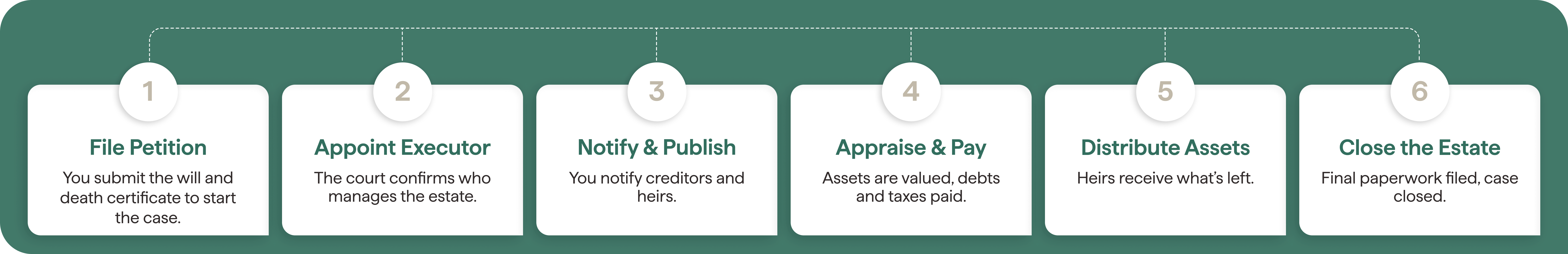 At a high level, the probate process follows these steps; forms and timing vary by state.