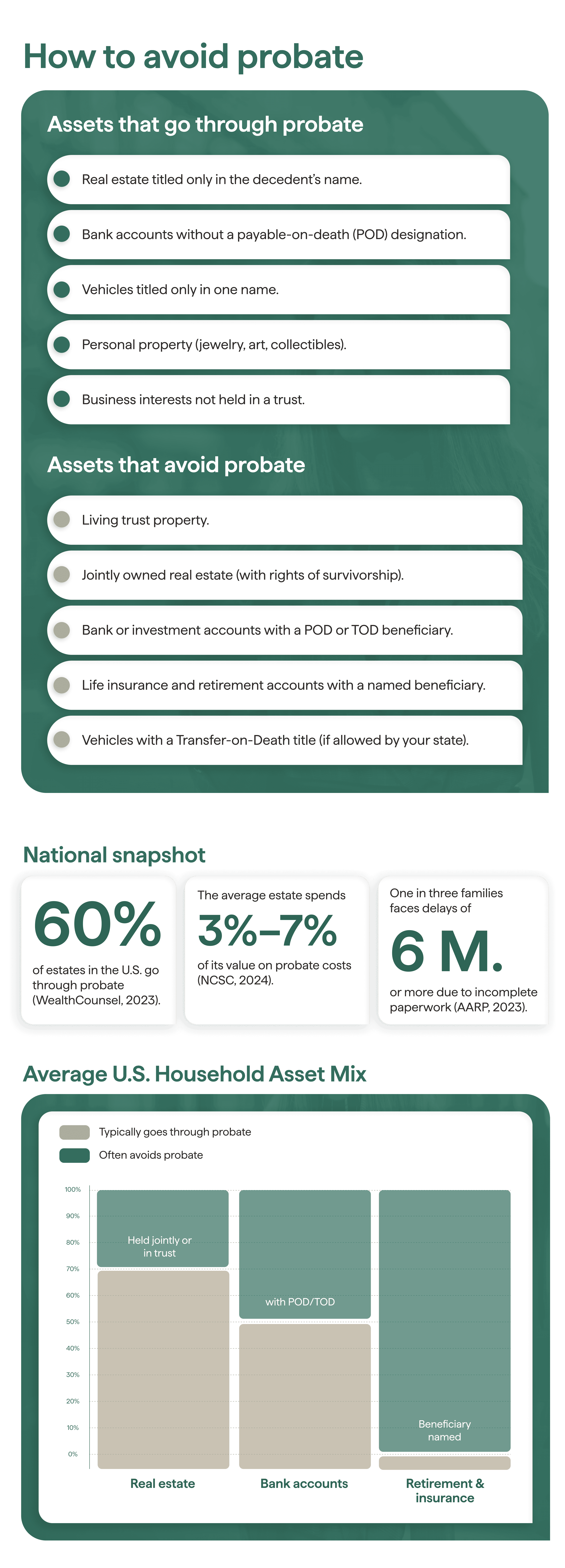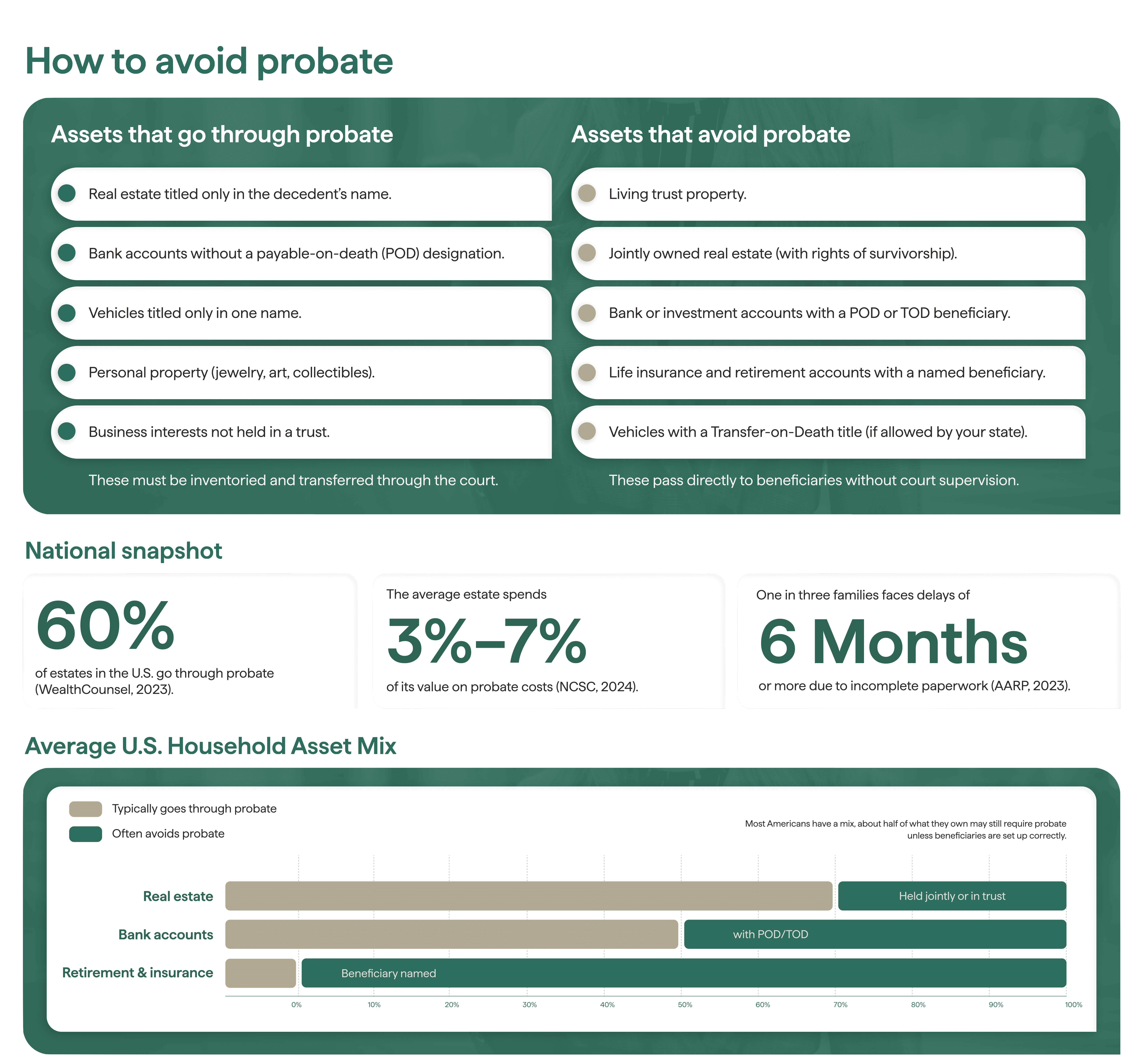 You can often avoid probate when assets are set up to transfer automatically at death. Common ways include: